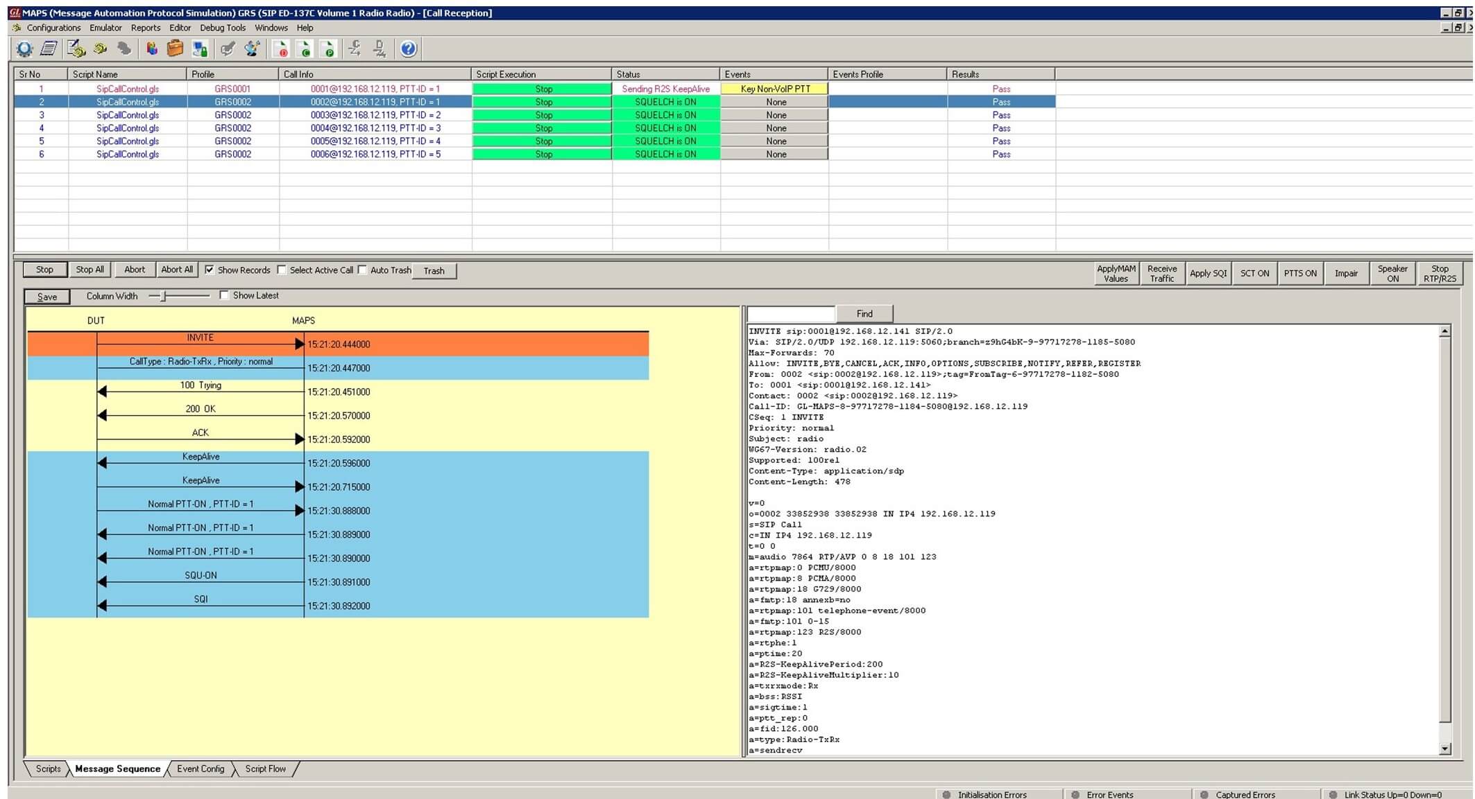 Once a call is established between the two terminals ‘KeepAlive’ messages are exchanged between the terminals. Many other Events can be applied at CWP/GRS on an ongoing call such as PTT priority handling, Send Re-Invites,, Apply Time Delay in msec, Start/Stop sending RTP Audio/R2S-Keepalives, Start/Stop Impairments, Receive Traffic (i.e. record to file, detect digits/tones), Update Signal Quality Information, Radio Remote Control signal, and Playback the call on PC speaker.