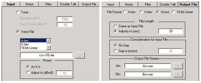 Thus, two files Ain and Bin are generated in this process. Ain consists of input and noise with proper power level. Bin is the echo version of Ain file along with noise and/or double talk (optional).