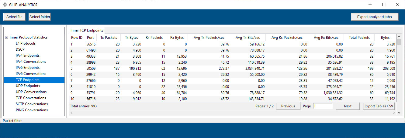 Supports Inner protocol statistics for L4 Protocols, DSCP, IPv4 Endpoints, IPv4 Conversations, IPv6 Endpoints, IPv6 Conversations, TCP Endpoints, UDP Endpoints, UDP Conversations, TCP Conversations, SCTP Conversations, and Ping Conversations. Also provides advanced filtering capabilities for Outer protocol with filter expressions such as “eth.type, length, ip.dscp, ip.addr, ip.src, ip.dst, ip.proto, udp.port, udp.src, udp.dst, tcp.port, tcp.src, tcp.dst, port, sctp.src, and sctp.dst”.