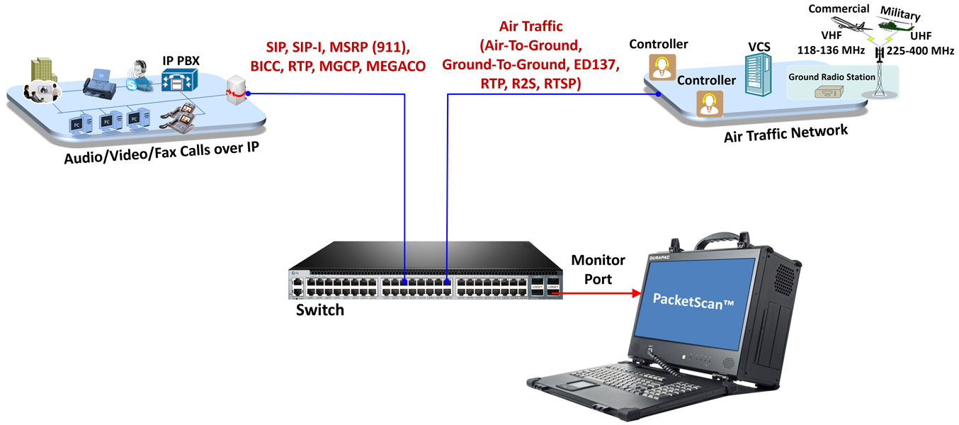 GL’s PacketScan™ is a real-time monitoring and protocol analysis tool designed for IP-based networks. It supports ED‑137 and ED‑138 standards and is used to capture and analyze live signaling and voice traffic over both IPv4 and IPv6. PacketScan™ can monitor all types of traffic, including voice, tones, digits, video, and fax. It measures key voice quality parameters such as Mean Opinion Score (MOS), jitter, delay, packet loss, duplicate packets, and out-of-sequence packets.