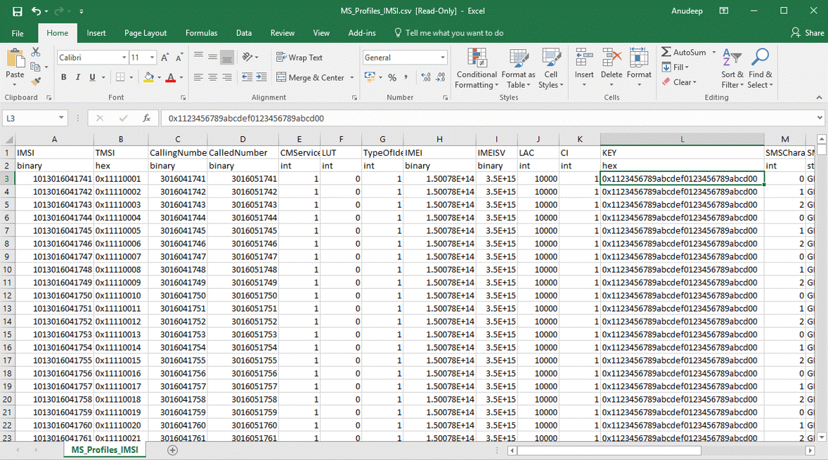 - CSV File Name for Key Calling Number: Here the CSV profiles are loaded based on the key parameter such as Calling Number. The CSV file is created and configured with different parameters like IMSI, TMSI, and Subscriber Numbers etc. which are used as database to simulate N number of Subscribers. During Call Reception, the incoming call is handled based on the key identifier: Called Number. Once the call is received, it will search the CSV file for the Called Number. Using the ‘GetRecord’ command the unique IMSI, TMSI, etc. parameter values for the subscriber is fetched from the CSV file.
