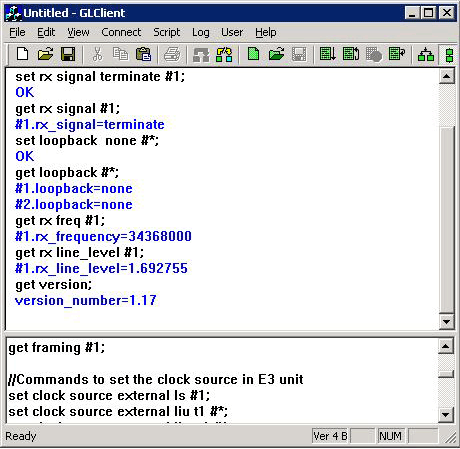 A client communicates with the server via TCP/IP encapsulated commands/tasks/responses. GL provides sample-working clients written in C++, C#, Windows TCL, and Windows/Linux Python. The user may expand on these, as the user desires. Both commands and tasks are high-level functions, e.g., Rx signal settings, loopback settings, alarm monitoring, transmit receive framing formats, and so on. A client can initiate multiple tasks simultaneously or sequentially (queue up tasks in succession). All exchanges between the client and server are displayed and can be logged to a file for later viewing. Batches of commands/tasks can be saved or loaded for efficiency. 'cut' and 'paste' features are also provided.