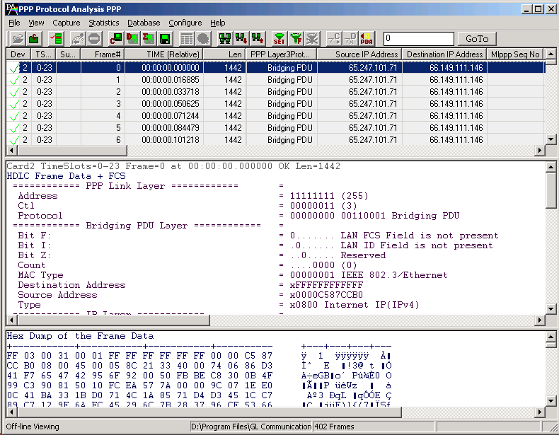 The PPP analyzer application is invoked from the main menu of GL's T3/E3/Datacom Analyzer for real-time analyzer. The analyzer displays summary, detail, call trace, statistics, and hex dump views in different panes. The summary pane displays Dev#, Frame #, Time relative, Len, Error, Layer 3 protocol, LCP code, IPCP code, BCP code, PPP Message type, Source/Destination IP address, TCP Source/Destination Port, UDP Source/Destination Port, Message Type, and so on. The User can select a frame in summary view to analyze and decode each frame in the detail view. The Hex dump view displays the frame information in HEX and ASCII format