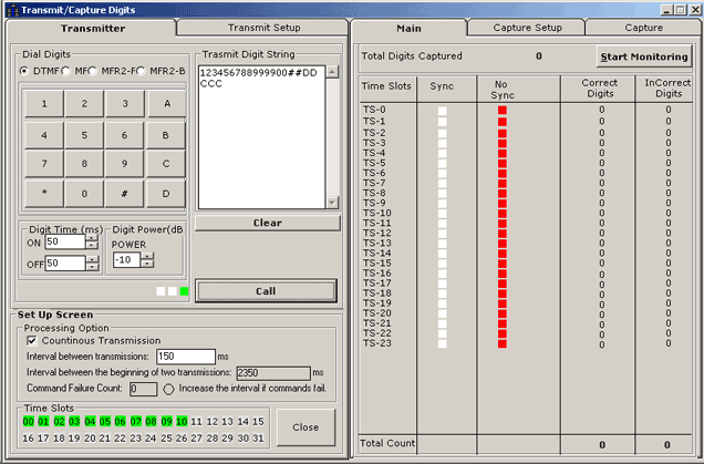 Transmit and Capture Digits:he Capture Dialed Digits application provides the capability to capture and display DTMF and MF (along with MFR2-forward and MFR2-backward) digits as they are received on one or several time slots. This application provides two basic modes of operation: Manual and Scan for Offhook Modes.